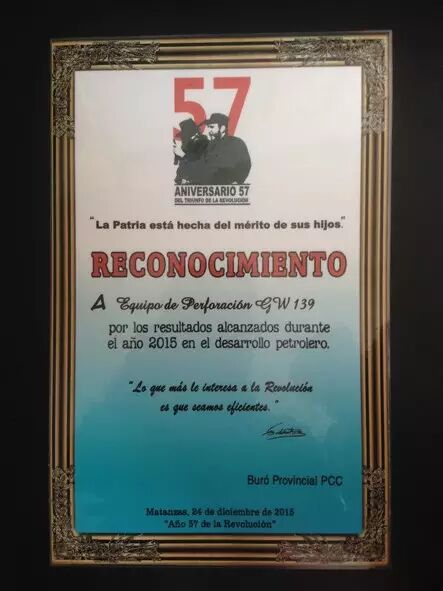 12月24日,长城钻探古巴项目GW139队荣获一份印有菲德尔愠斯特罗签名章奖状,表彰其在SEB-24井作业过程中的突出成绩以及为古巴石油工业做出的杰出贡献。古巴人民共和国马当萨省省长亲自到古巴石油公司为GW139队颁发该奖,并高度赞扬了GW139优异的作业业绩,以及长城钻探对古巴经济发展的巨大贡献和中古两国人民兄弟般的友谊。