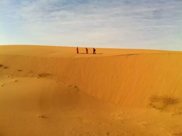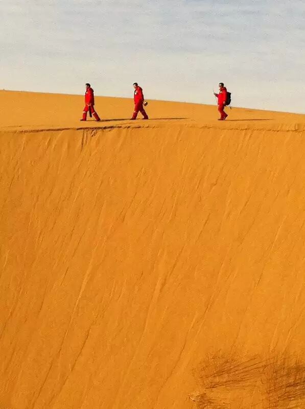 风沙肆虐,一些输气管线会随着沙丘的移动,或深埋于地下,或裸露出地面。为了保证管线平稳、安全输气,在苏里格气田项目部采气作业二区到长庆采气三厂的这段荒漠上,经常会看到这样一组“全副武装”的巡线人。这段仅仅16公里的输气管线,他们往往要走上4个多小时,翻越一座座沙丘,细心的巡护着每段管线。