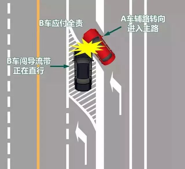 在城市主干路上,一些并入主干路的辅路入口,都会有转向并入的导流带,而在入口之前也会有相应的导流带,引导主路车辆避让前方入口车辆。而如果此时有车辆直行闯入导流带,与正在转向进入主路的辅路车辆发生事故,那么闯入导流带的车辆,是要负全责的。