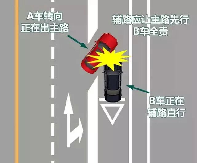 这个情况比较常见,也很好理解。当主路车辆转向准备进入辅路时,辅路车辆即便是直行,也必须让行主路车辆。一旦发生交通事故,则辅路抢行的车辆全责。