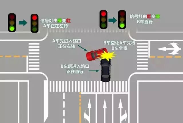 如果A车越过停止线,通过交叉路口过程中,信号灯由绿变红,另一方向信号灯由红变绿,这时后进入交叉路口的B车辆,必须让行A车通过,一旦发生交通事故,则B车全责,A车无责。这种情况非常常见,但是责任如何认定,很多人并不十分了解。